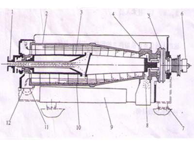 如图3所示料液进入离心机后,在离心力作用下分层,实行固液分离脱水。随着固相颗粒在转鼓内逐渐沉积形成沉渣层,沉渣中水分由于固相颗粒的挤压作用被压向渣表面,然后沿螺旋通道流回沉降区,脱水区沉渣在压密脱水过程中受到转鼓的拖曳作用向转鼓排渣口运动,完成离心脱水过程。该机采用大长径比、高转速、小差速系统结构,使物料在机内澄清和脱水停留时间增加。此类脱水机处于封闭状态运行,能防止臭气散发。处理能力相对较大,可连续运转,滤饼含固率和滤液含固率相对均较好。但由于高速旋转造成电能消耗高,有一定振动噪声,且设备结构较复杂和磨损相对较大,使日常维修保养费用较大,影响了应用面扩大。